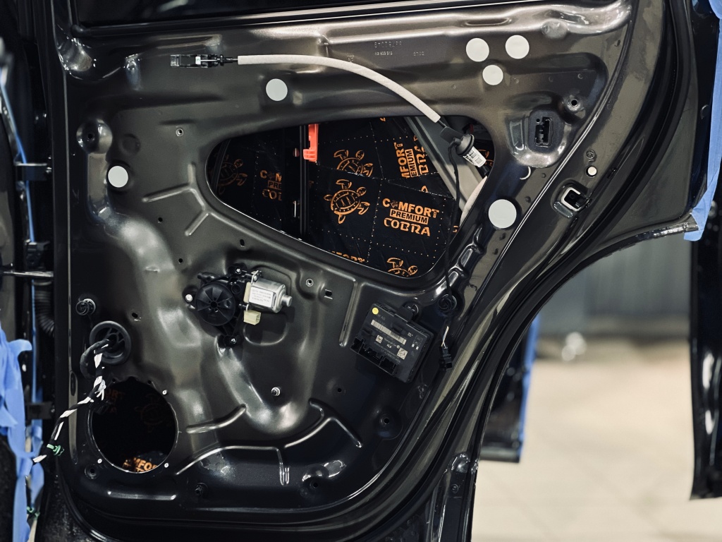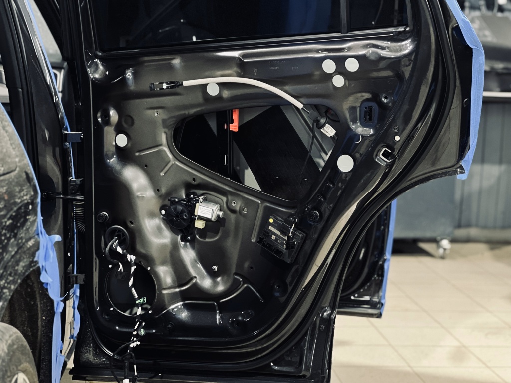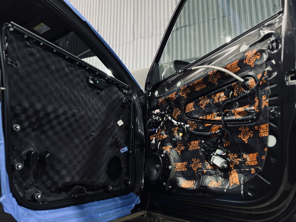 Двери – важный элемент шумоизоляции, так как через них проникают звуки улицы, ветра и двигателя. Мы обработали двери в несколько слоев, чтобы обеспечить тишину и улучшить звучание акустики. Работа началась с демонтажа дверных карт, обнажив металлическую поверхность.